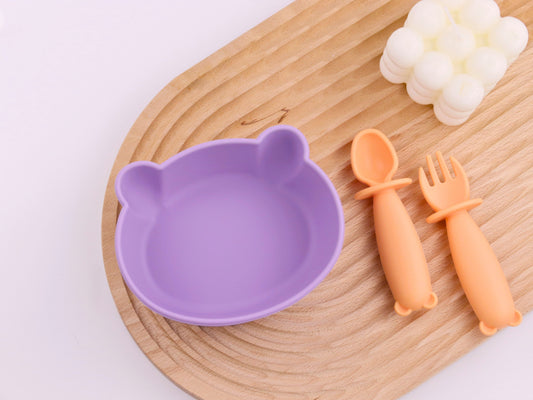 Bear Shaped Silicone Baby Bowl Feeding Set (Peach Lilac)