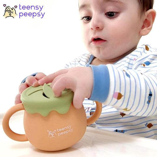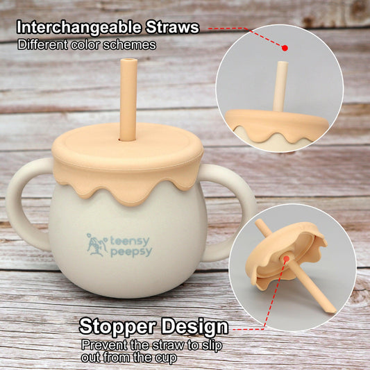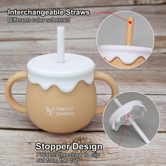 3-in-1 Silicone Sippy Cup, Honeypot Training Cup with Straw and Snack Lid (Sandy Beige)